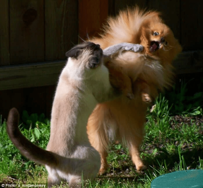 A cat caught mid-swing as it appears to punch a dog. It’s the internet’s favorite type of chaos — adorable, funny, and impossible to stage.