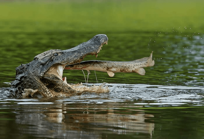 Nature at work — a fish leaps right into an alligator’s mouth. Terrifying and fascinating all at once.