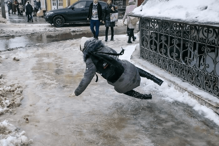 Someone mid-slip on a wet sidewalk — the instant before gravity wins. Clumsy, funny, and completely human.